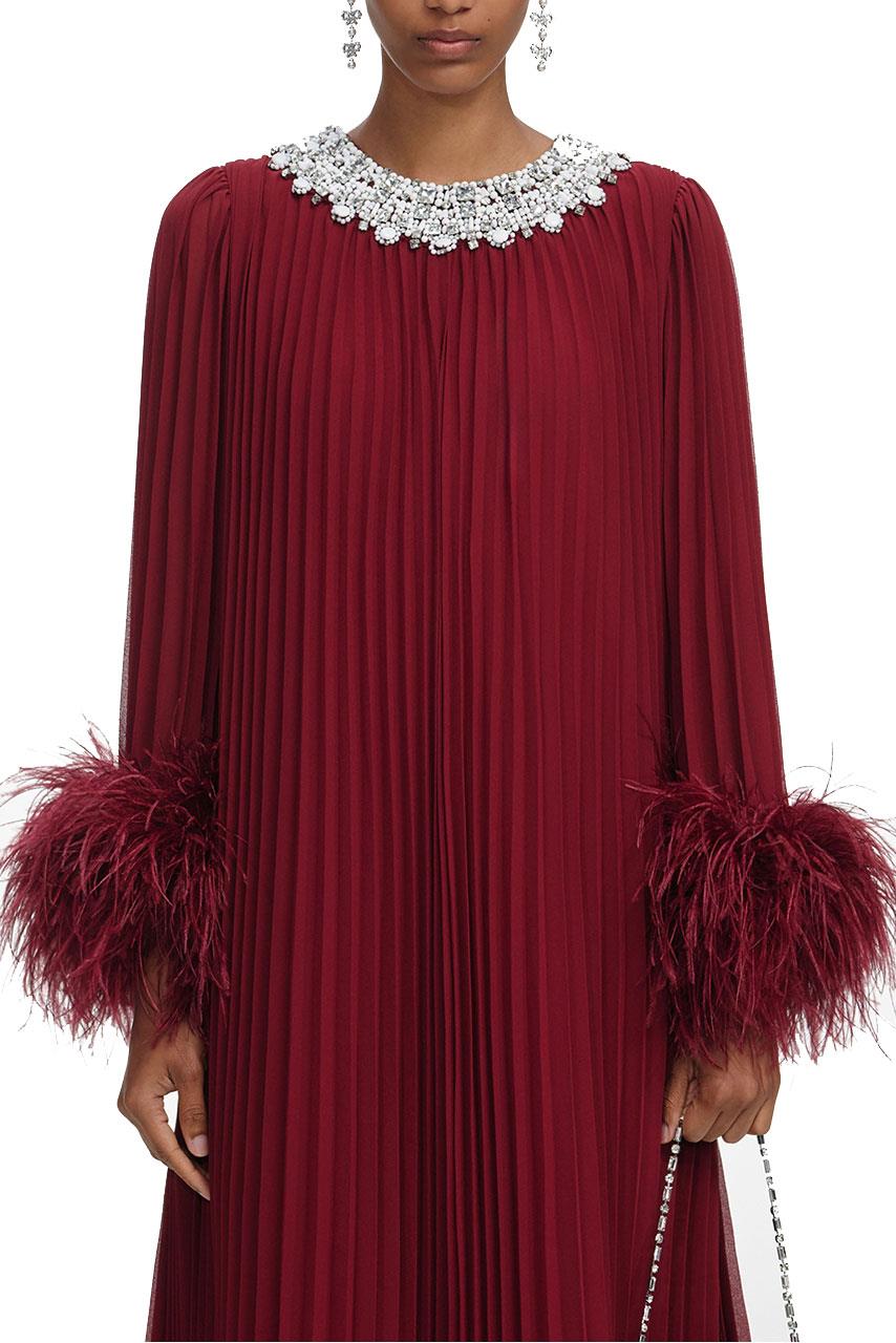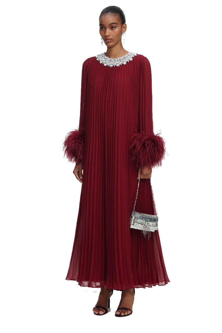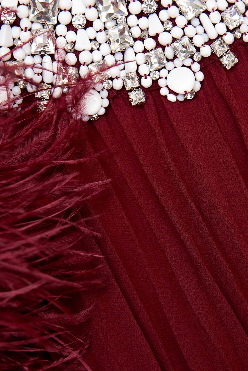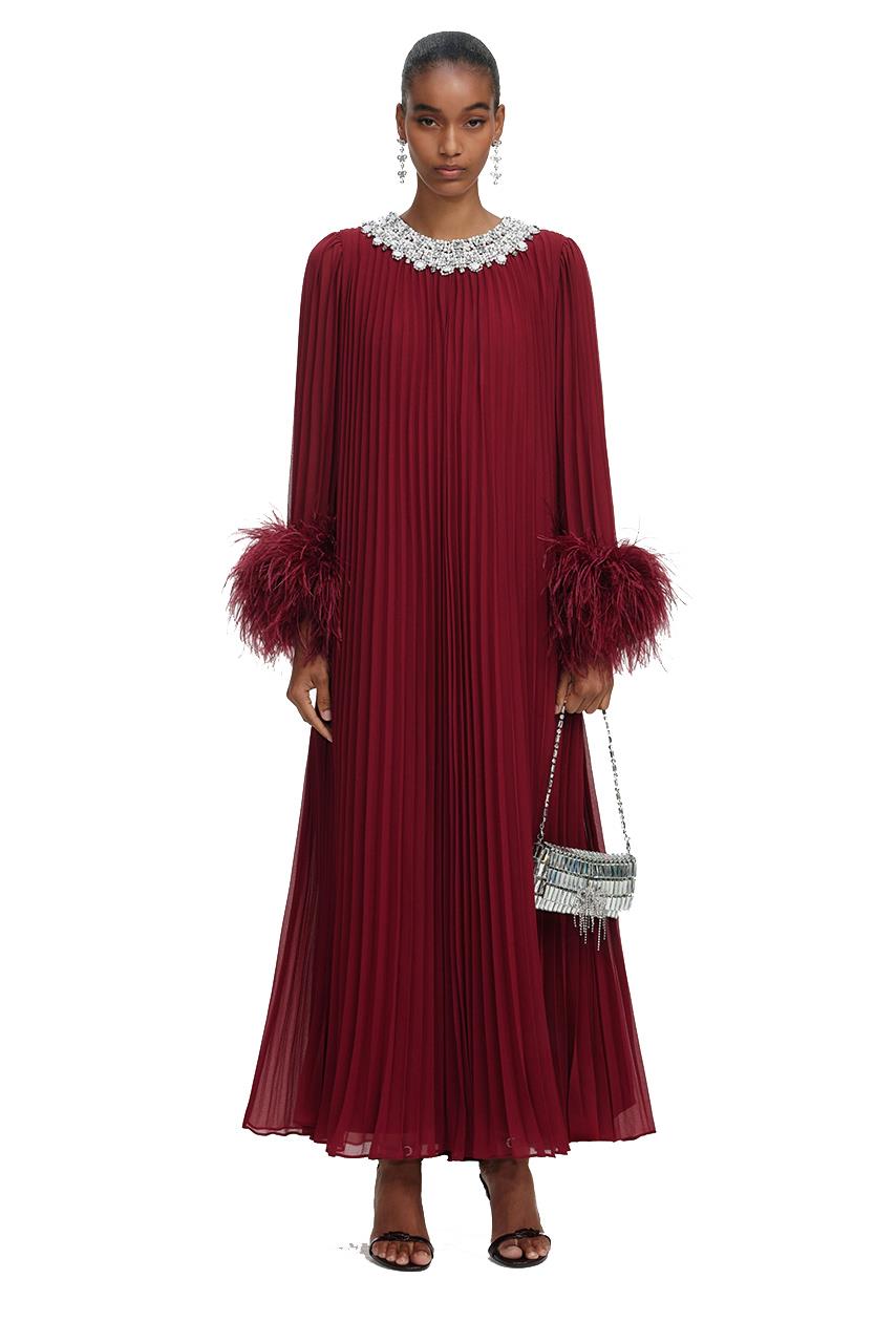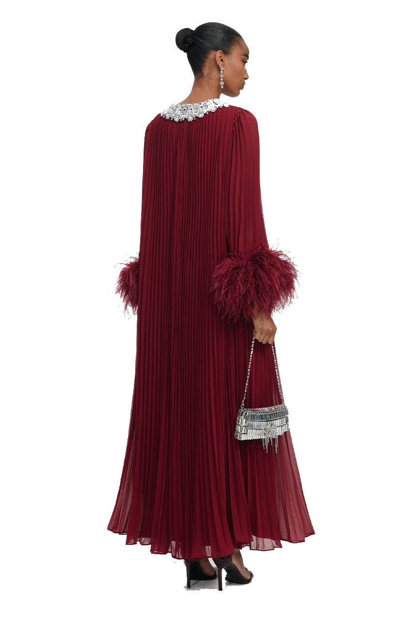 Embrace drama in this head-turner, cut from burgundy pleated chiffon for a voluminous yet lightweight feel. Accessories come included with diamanté and pearl trims and oh-so-chic feather cuffs.